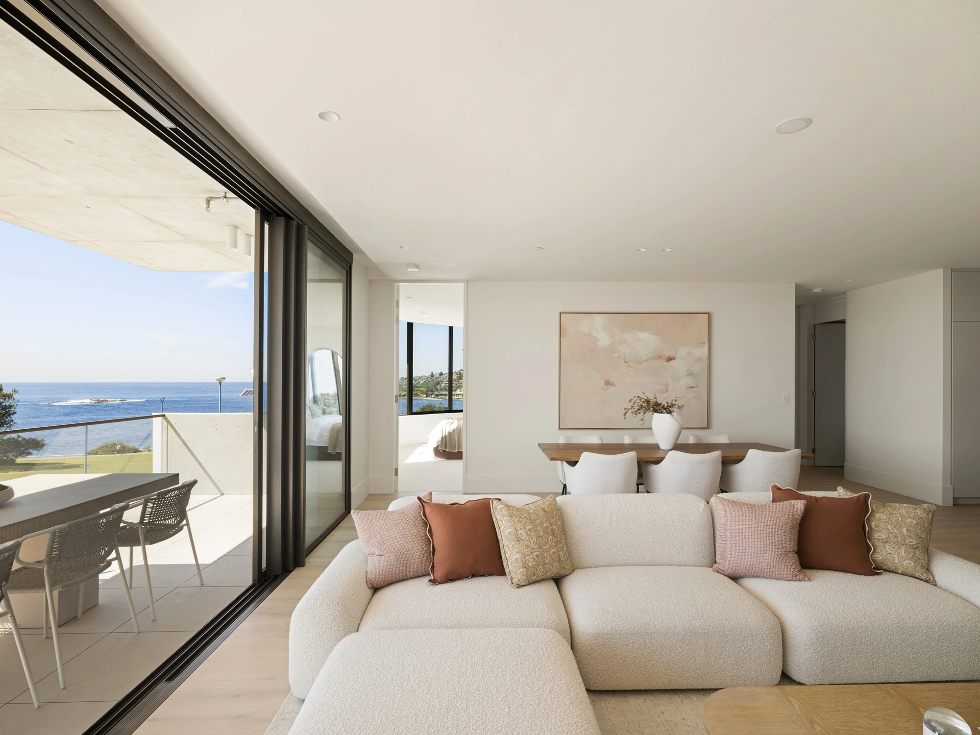 Floor-to-ceiling glass doors open to a sparkling ocean panorama as Coogee’s iconic