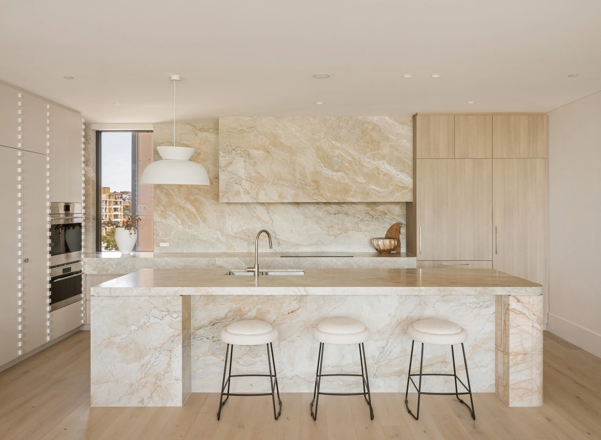 Drawing inspiration from coastal textures, with warm, natural timber and striking veined marble, each kitchen is designed to feel both elegant and functional. An oversized island bench takes centre stage, evoking a sophisticated, natural aesthetic. Geometric, detailed joinery and a soft palette create a versatile and welcoming space for everyday living and entertaining, further elevated by premium Astra Walker tapware and Sub Zero Wolf appliances.