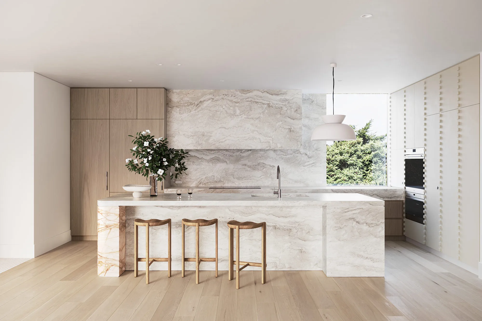 Drawing inspiration from coastal textures, with warm, natural timber and striking veined marble, each kitchen is designed to feel both elegant and functional. An oversized island bench takes centre stage, evoking a sophisticated, natural aesthetic. Geometric, detailed joinery and a soft palette create a versatile and welcoming space for everyday living and entertaining, further elevated by premium Astra Walker tapware and Sub Zero Wolf appliances.