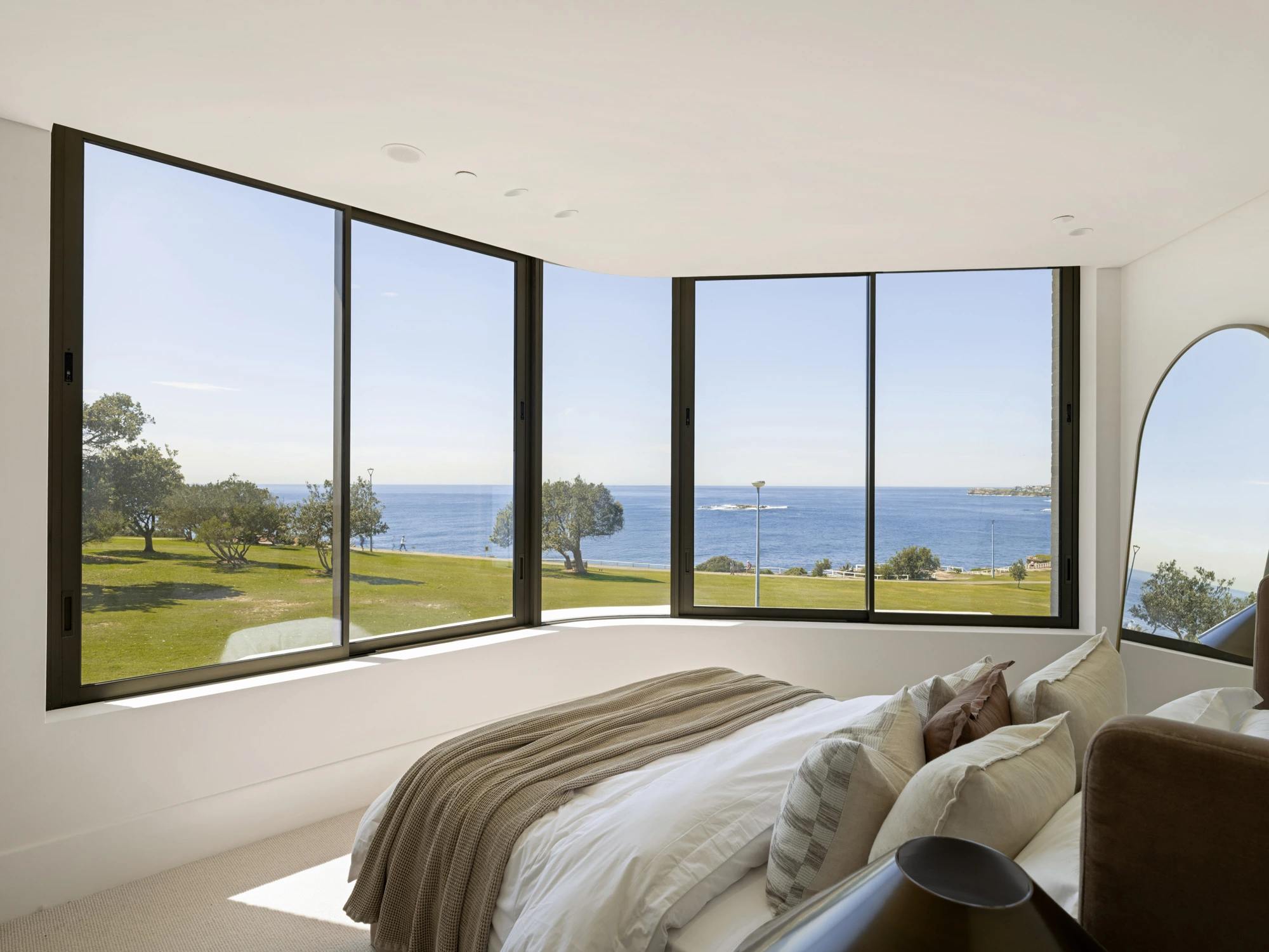 Floor-to-ceiling glass doors open to a sparkling ocean panorama as Coogee’s iconic